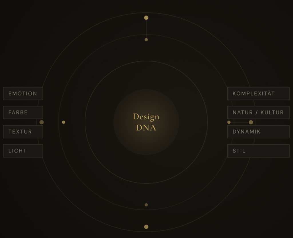 Unser KI-Modell analysiert die gewählten Bilder auf 9 designrelevante Dimensionen — von Emotion und Farbe bis zu Komplexität und Raumgefühl.